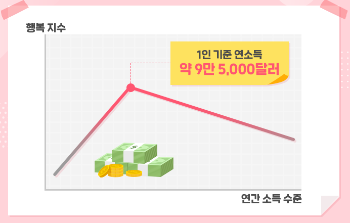 사람들이 처음에 돈을 벌 때에는 돈이 많아질수록 행복감이 점점 커지다가 9만 5천 달러(환율 1,100원 환산 1억 원 상당) 이후부터는 행복감이 감소한다는 조사였습니다.