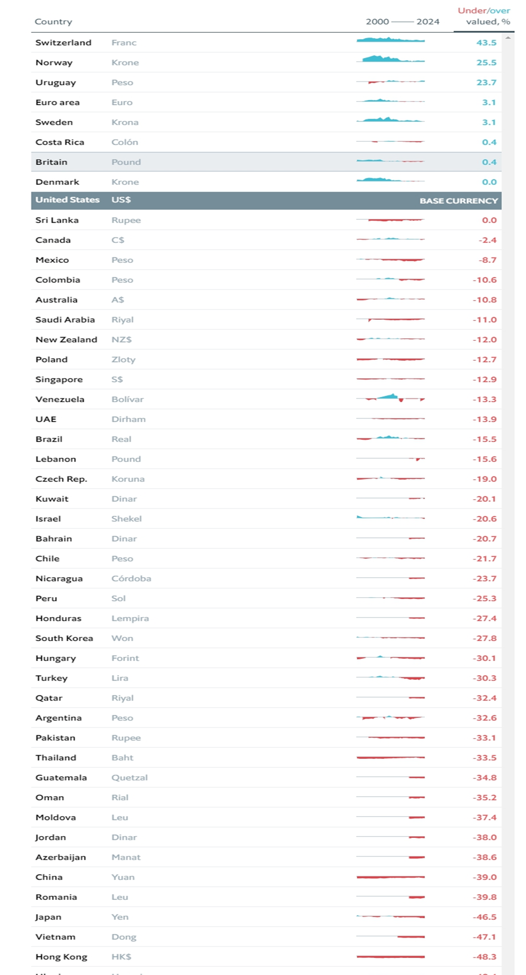 위의 표는 24년 나라별 빅맥지수입니다.